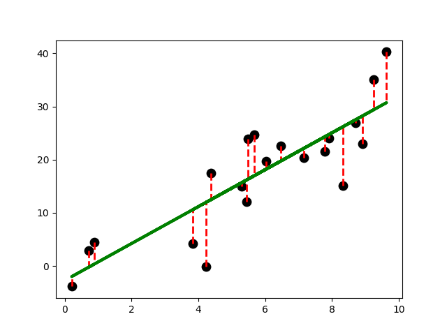 plt.plot([x[i][0], x[i][0]], [y[i][0], y_pred[i][0]], color='red', linestyle='--', lw=2)