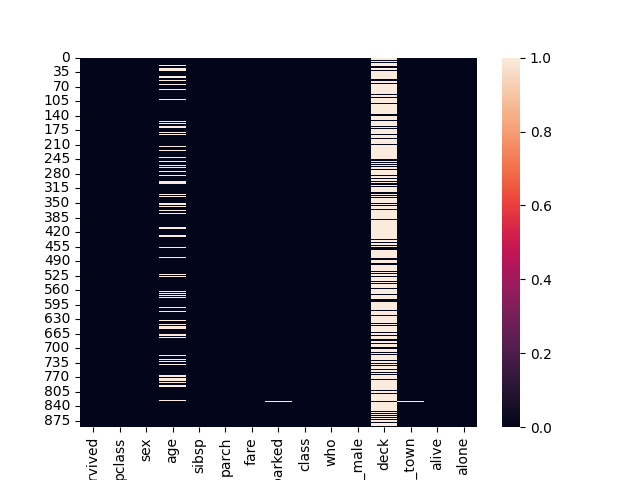 survived 0 pclass 0 sex 0 age 177 sibsp 0 parch 0 fare 0 embarked 2 class 0 who 0 adult_male 0 deck 688 embark_town 2 alive 0 alone 0 dtype: int64